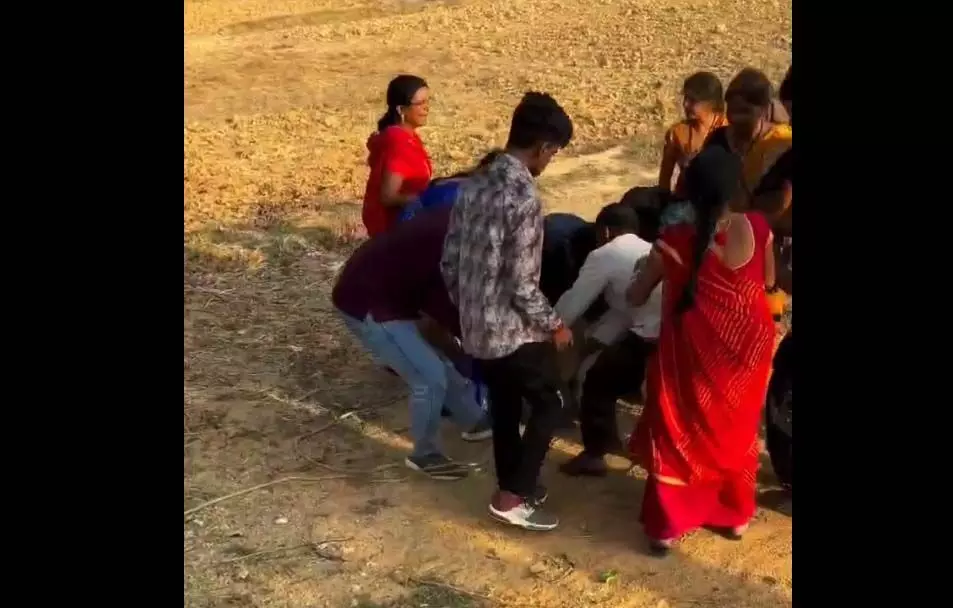 Jashpur. The video of a mischievous youth being held hostage and beaten up is going viral on social media. This incident is from Keradih village of Narayanpur police station in Jashpur district. According to the information, the mischievous youth chased the baraati bus and broke the glass of the vehicle.